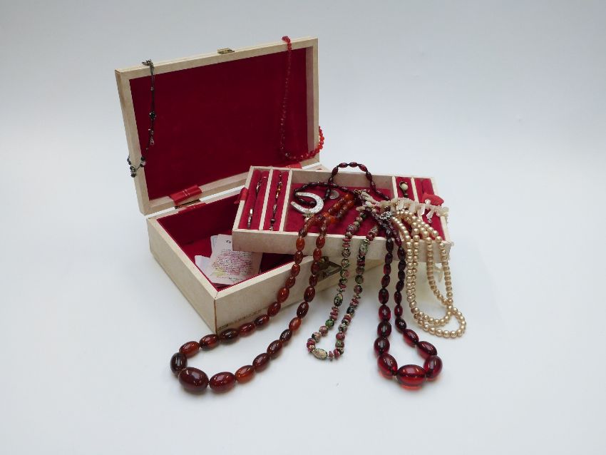 A collection of costume jewellery including mother of pearl necklace, Victorian cameo brooch, silver pendant, rolled gold locket, silver rings, amber necklace, military brooch etc