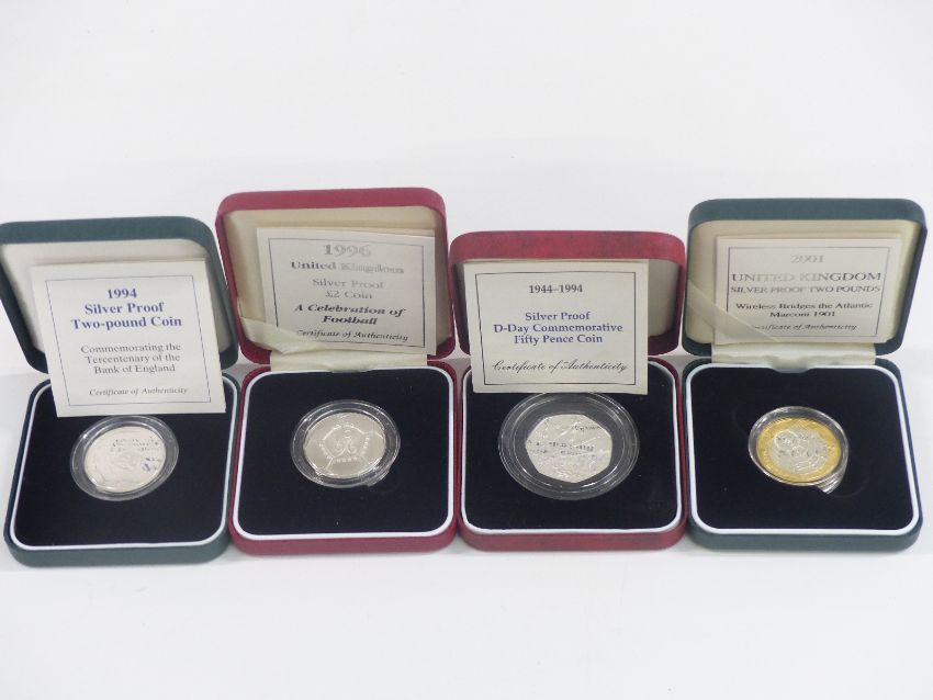 Four cased Royal Mint silver proof coins comprising 1994 Tercentenary two pound, 1996 football two pound, 2001 Marconi two pound and 1994 D Day fifty pence, with certificates