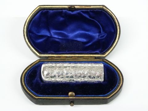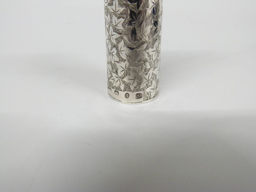 Victorian hallmarked silver scent bottle with engraved ivy leaf decoration, Birmingham 1893 maker Hilliard & Thomason, length 5.5cm, in original fitted case