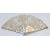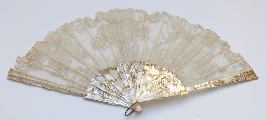 A 19thC mother of pearl and lace fan, the ornate pierced decoration set with white metal and gilt flora and fauna, the lace work with fine floral decoration, in silk covered box, the guard sticks 25.5cm