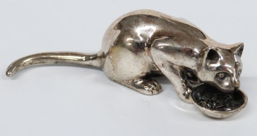 White metal novelty model of a cat eating from a bowl, marked 925 Italy, length 5.75cm, weight 20g