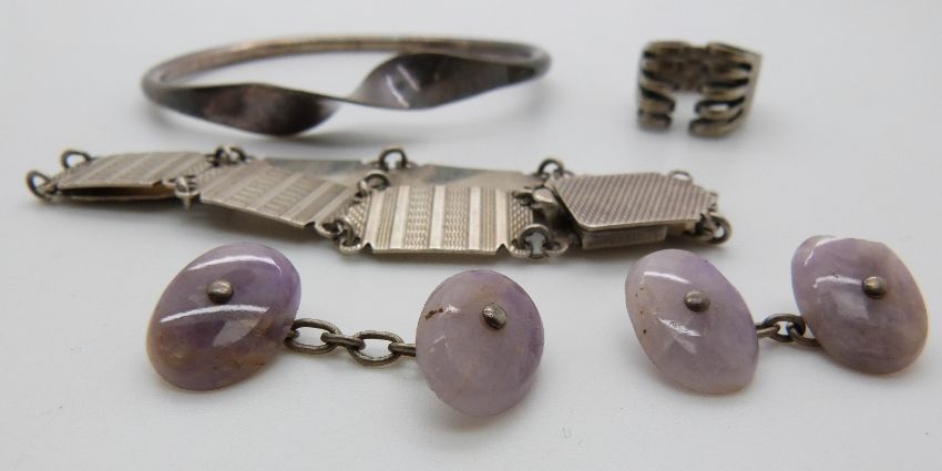 A silver bangle marked Norway, ring marked AGE Norway, silver bracelet and agate cufflinks