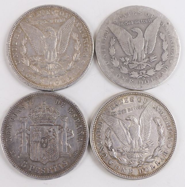 Three Morgan dollars, Detroit, New Orleans mint marks 1898, 1896 and 1921, together with an 1883 Spanish 5 pesetas