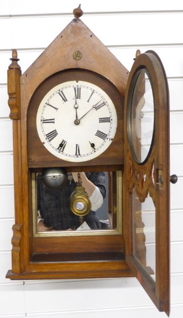 Nineteenth century probably American wall clock in Oak steeple style case. Thew pattern Roman dial with the breguet style hands. Brass pendulum bob with  inset enamelled decoration. The case with glass door and mirrored back. Two train movement striking a bell. 71cm Tall