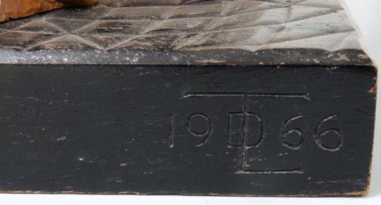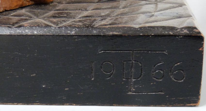 The Broken Xth commandment carved wooden figures surrounding an X, an ebonised base, monogrammed TDL 1966 and titled to underside, height 40cm