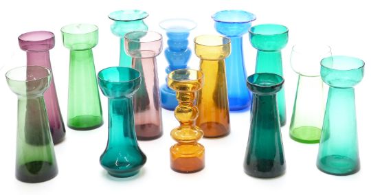 Fourteen coloured glass hyacinth vases all of elongated form, largest 20.5cm tall.