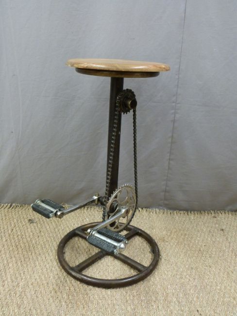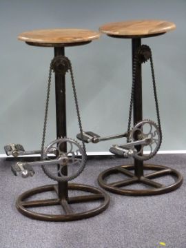 A pair of industrial style bar stools with bicycle pedal foot rests and chains H70cm
