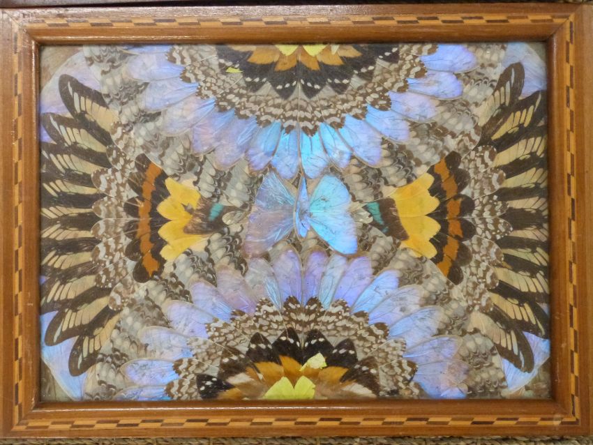 Three inlaid South American trays with butterfly wing decoration, largest 63 x 38cm