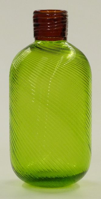 A green art glass bottle vase with wrythen moulded body and trailed brown collar, 25cm tall.
