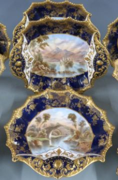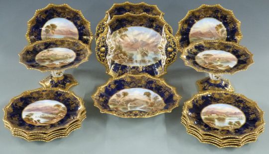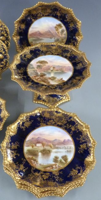 Aynsley late 19th/20thC dessert service of twelve plates, two tazzas and three serving dishes, hand decorated with named Scottish scenes including Brig o' Doon, Bothwell Castle, Kilchurn Castle, Linlithgow, Loch Leven Castle, Loch Vennachen, Ronarno Castle, Loch Monteath, Loch Katrine, Loch Fad and Keens Cottage, Loch Lydon, Loch Cullin, Dumbrody Abbey, Loch Achray, Loch Oich, Loch Tay and Doune Castle, all with additional gilded decoration on segmented and gadrooned dishes, monogrammed W H C, diameter of plates 21.5cm