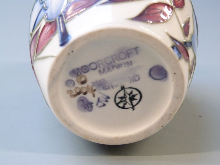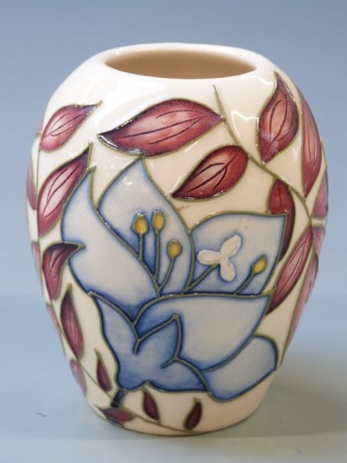 Moorcroft vase decorated with blue flowers on a cream ground, initialled JW and dated 2004 to base, 9.5cm