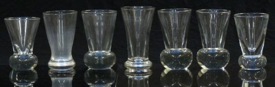 Seven various 19thC and later clear firing glasses, some raised on bulbous bases, largest 11cm tall.
