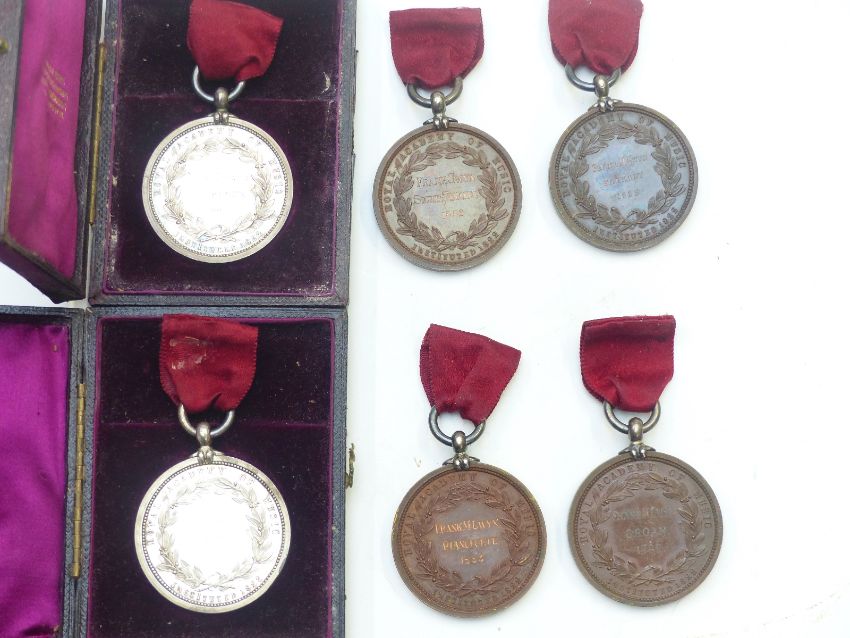 A collection of Victorian Royal Academy of Music medallions, circa 1884, includes white metal and bronze examples by R Wyon, some cased, Primrose League medal, RMS Lusitania plaque and a WWI medal awarded to 3798 Pte F S Bailey, Gloucestershire Regiment