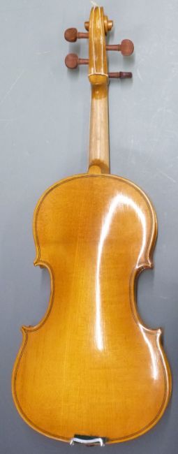 Lark full size late 20th century violin in blonde lacquered finish, two piece 35.5cm back, complete with case and bow