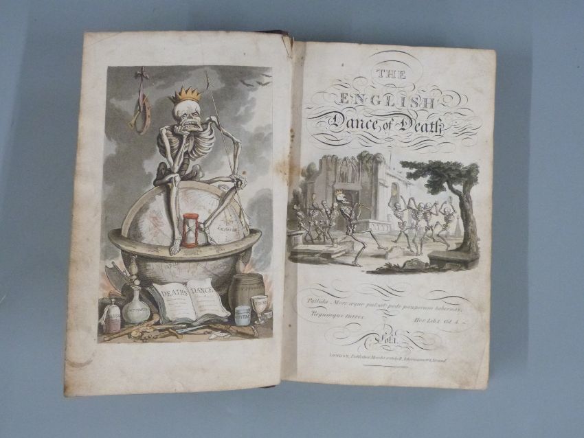 [Occult, Macabre] The English Dance of Death by Hans Holbein from the Designs of Thomas Rowlandson with Metrical Illustrations, printed by J. Diggens and published at R. Ackermann’s Repository of Arts in 1815 (engraved title dated March 1 1816) volume one illustrated with hand coloured aquatint plates, bound in brown marbled leather with gilt tooled spine & title labels