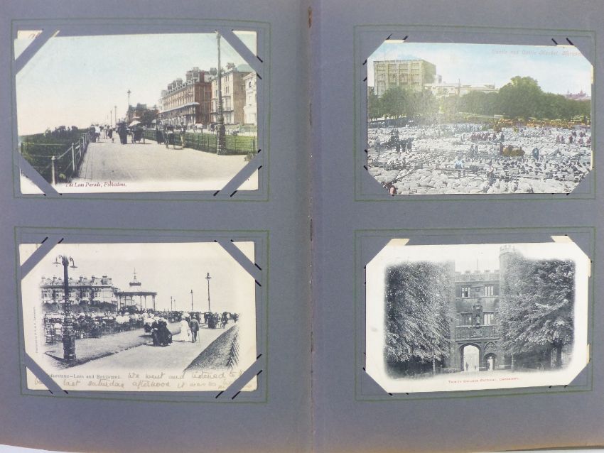 Early 20th century postcard album of approximately 200 cards including London, railway, Hampstead, Bishop's Stratford, Oxford, Isle of Wight, Broadway, Welsh bridges, Glasgow, Paris etc