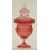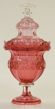 Bohemian cranberry glass comport and cover with deep cut decoration, raised on pedestal base, 32cm tall.