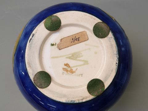 Moorcroft squat pedestal vase in Magnolia pattern on a blue ground, 11cm tall