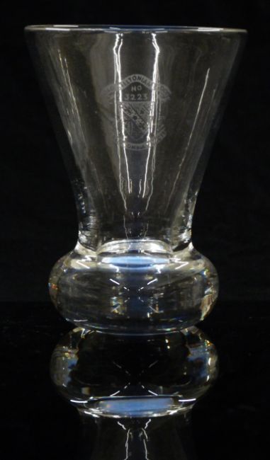 Five various 19thC and later clear firing glasses all with Masonic and similar engraved decoration including Connaught and Old Cheltonian Lodges, one raised on a faceted base, largest 10.5cm tall.