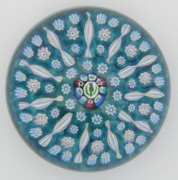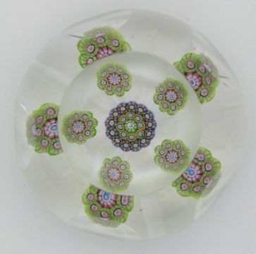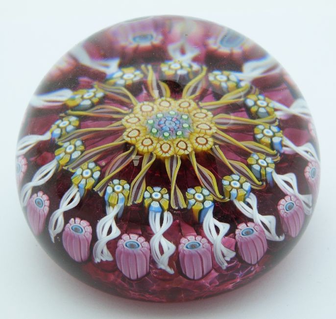 Four millefiori glass paperweights one John Deacons with thistle cane, and three Perthshire including one faceted with patterned canes, largest 77mm in diameter, two in original boxes.