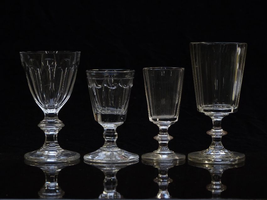 Eight 19thC and later clear cut glass drinking glasses, all with single knopped stems, one with Masonic interest engraving, largest 13.5cm tall.