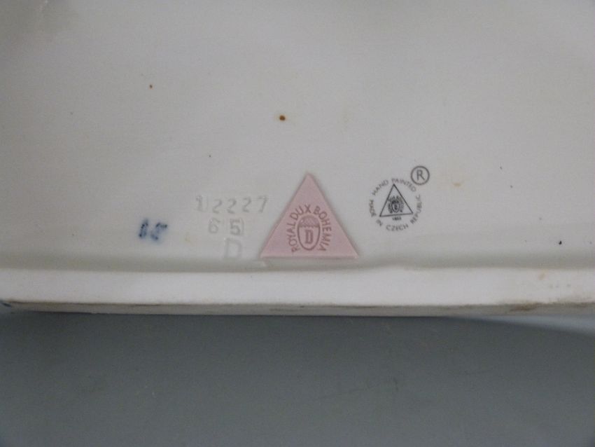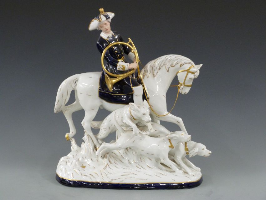An exceptionally large Royal Dux figure of a huntsman on horseback with horn and three hounds, height 49cm