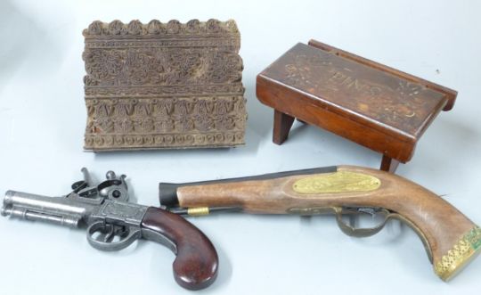 Glazed hanging lantern, stone finial, replica pistols, door stop, printing block, Hawkeshead / Forville size 7 shoes etc