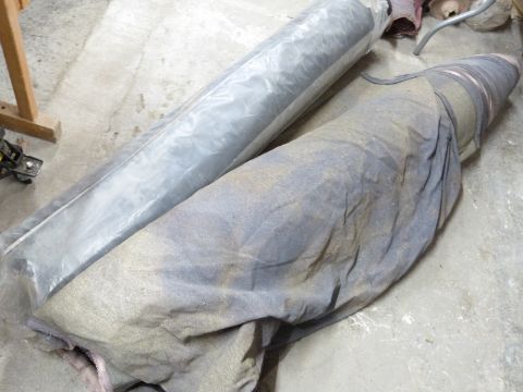 Two bolts of black velour fabric with hemmed edges, haberdashery / textile / upholstery interest, width 1.6m