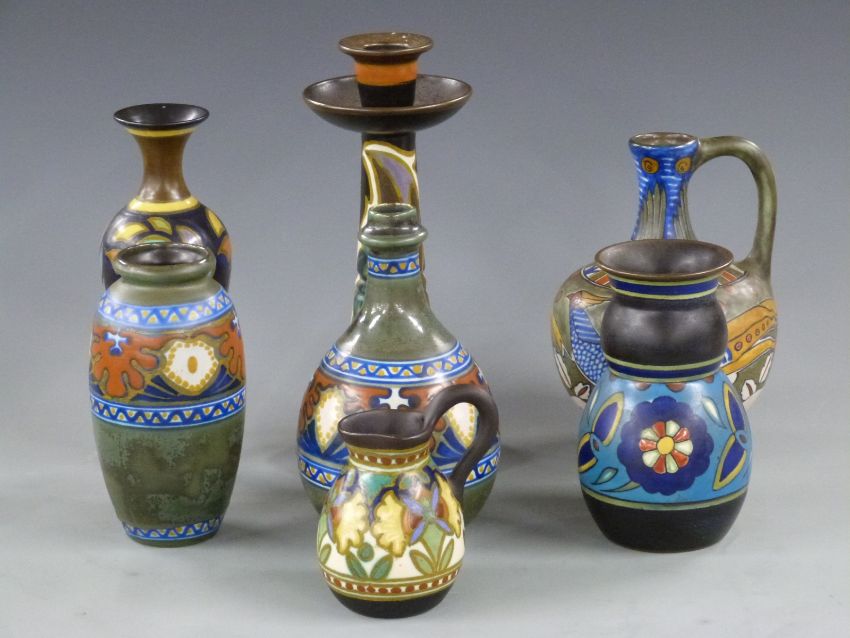 Gouda pottery vases, ewers, guglet and a large candlestick, tallest 29cm