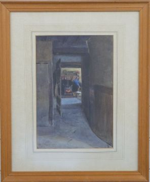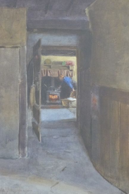 Possibly Italian watercolour of an elderly lady stoking a fire, indistinctly signed lower left possibly Alex Mahagerleto
