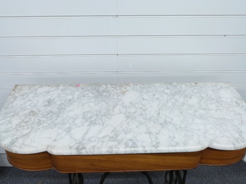 A marble-topped washstand with cast iron sewing machine base, W112cm