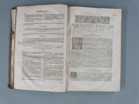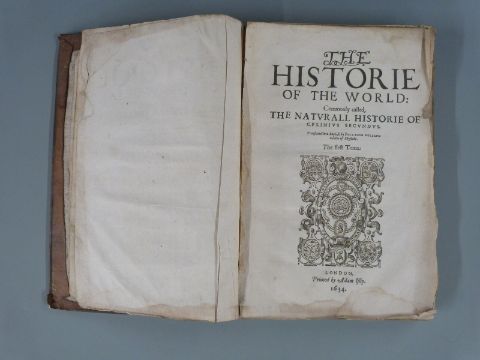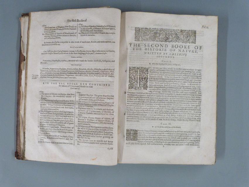 The Historie Of The World: Commonly called, The Naturall Historie Of C. Plinius Secundus. Translated into English by Philemon Holland, Doctor of Physicke, Printed in London by Adam Islip, 1634 The first Tome, a printed title with elaborate woodcut engraving and numerous decorative initial letters, bound in full leather with raised bands and early handwritten label on spine