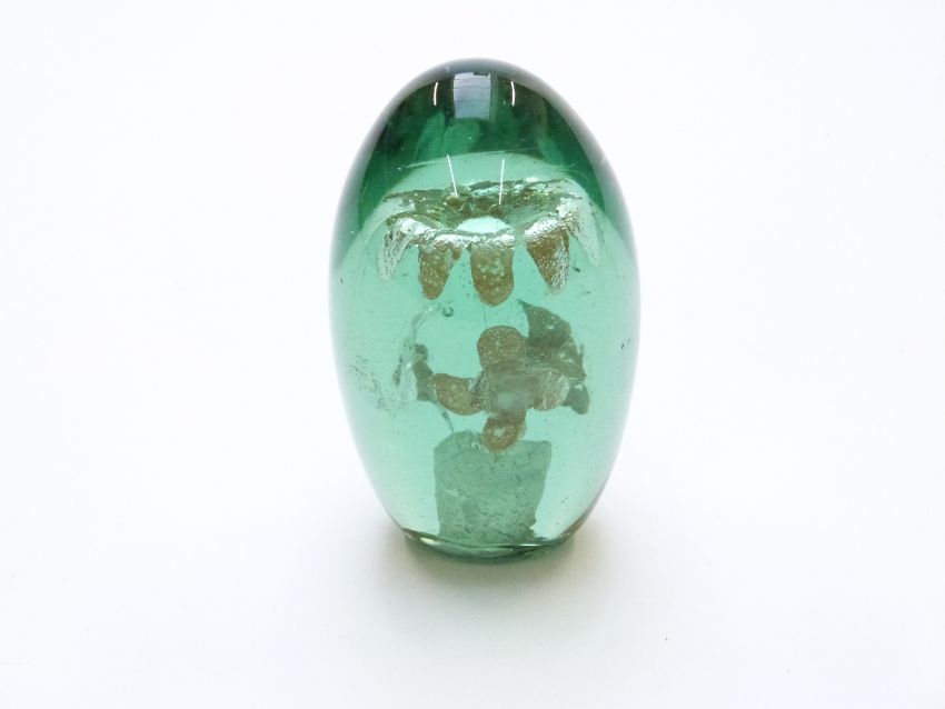 Nailsea green glass dump paperweight decorated with flowers, 13cm tall.
