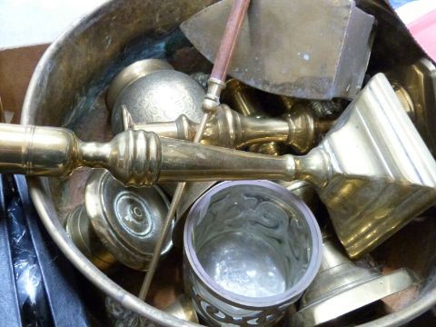 A large collection of brass jardinieres, jugs, lamp, trays etc