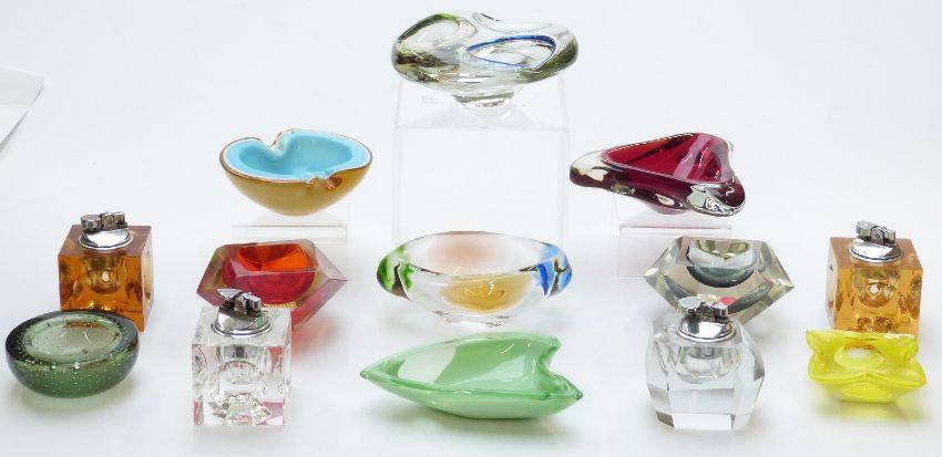 Nine glass dishes to include Whitefriars controlled bubble and Murano Sommerso examples, largest 17cm diameter, together with four glass table lighters