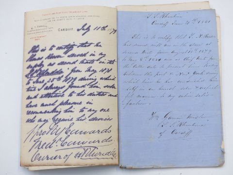 An album of ephemera pertaining to the Rosser family of Cardiff, specifically captain / harbourmaster / pilot Thomas Newland Rosser MBE and his father similarly named. Contents include Bristol Channel pilot's licence 1861, over 20 Merchant Navy discharge certificates mentioning various ships, the reverse all marked with "Very Good" conduct and ability, marriage certificates, pilot's rule books, newspaper clippings about Captain Rosser 1861-1961, Cardiff Pilotage Board centenary dinner booklet, personal correspondence from Miner's Society (of Welsh interest), some low denomination Victorian stamps, very early birthday postcard "Viewing the Procession", Christmas card from King George and Queen Mary 1914, interesting pilot's licence, certificate from Daniel Burges the younger, town clerk of the City of Bristol 1849 granting Thomas Rosser his pilot's licence for the Bristol Channel, Master's certificate, indentures, rule book of the Union Society, Oystermouth, Glamorganshire 1837, Board of Trade letters to Captain Rosser appointing him to the local marine board, letters of reference from ship owners, steamship companies, 1894 Porthcawl Advertiser and visitors' list, mariner's ticket, vesta etc entered for sale by direct descendants of Thomas Newland Rosser (1857-1935), dockmaster at Bute Docks (later the Cardiff Railway Company). He was apprenticed in 1872, gained his master's certificate in 1880, in 1885 he was appointed deputy dockmaster and in 1896 dockmaster. His father was also a pilot in Cardiff, having been so for around 40 years. Thomas Newland Rosser hosted Captain Scott and the Terra Nova before setting off on their Antarctic expedition. He was also present at two visits of the Royal Yacht Victoria and Albert III