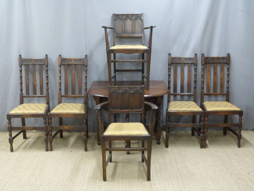 Six carved oak dining chairs and similar table with barley twist legs, length 91cm