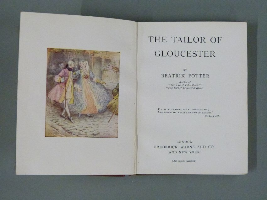 Beatrix Potter The Tailor of Gloucester published Frederick Warne & Co, copyright 1903 with colour illustrations. Original lettered boards with colour pictorial onlay front and illustrated endpapers