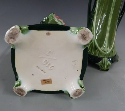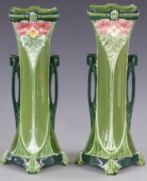A pair of Art Nouveau vases with stylised handles, 910/1 to base, 35cm tall