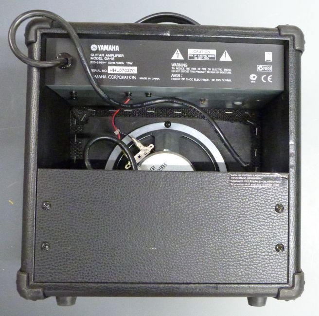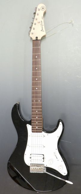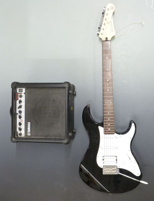 Yamaha Pacifica electric rhythm guitar with Yamaha GA-15 practice amplifier, both finished in black, with soft guitar carry case