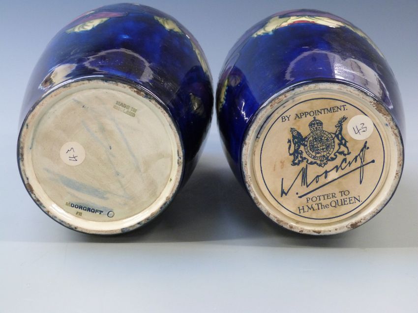 William Moorcroft pair of large baluster vases in Pansy pattern on a navy blue ground, one with full size base label 'by appointment, potter to HM the Queen' and both with signature and impressed mark to base, 26cm tall