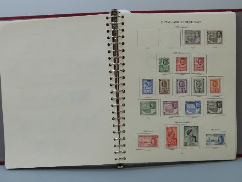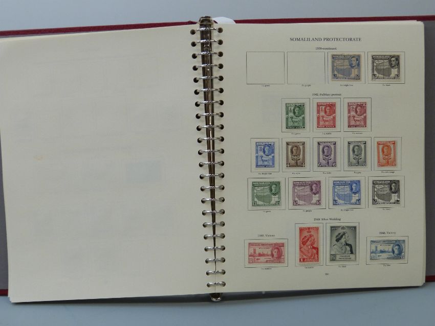 A boxed set of four Stanley Gibbons King George VI stamp albums. Mint and used stamps including high value 1948 RSW stamps, 1937 Coronation omnibus set, commemorative sets complete with high values etc