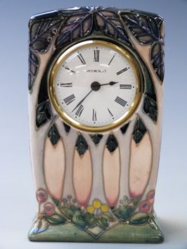 Moorcroft clock with tube lined decoration of trees, 16cm tall