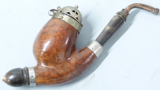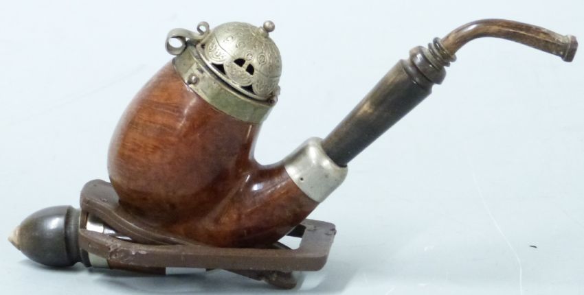 A German burr walnut and pewter pipe with horn mounts, on stand