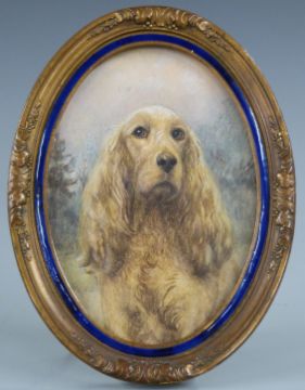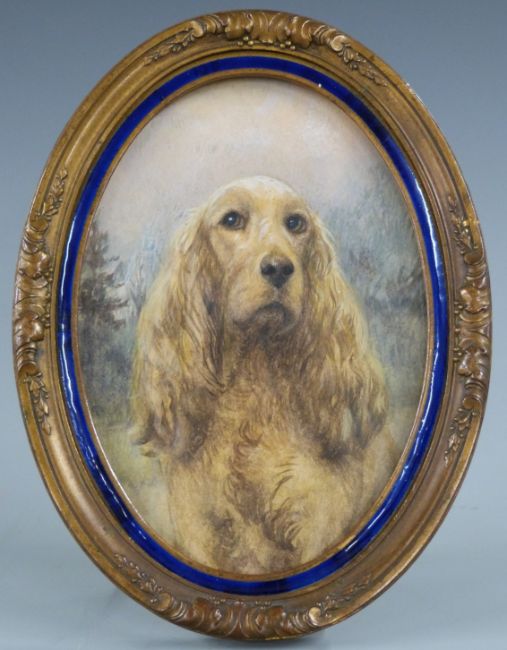 A 19thC watercolour miniature of a Cocker Spaniel in enamel and gilt frame, overall H16cm