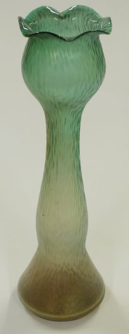 Loetz Papillon type iridescent glass double gourd vase with flared rim, 34cm tall.