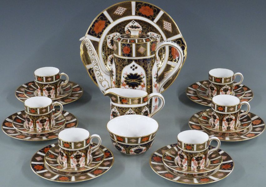 Royal Crown Derby Imari 1128 pattern six place setting coffee set with underplates and additional cake plate