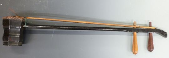 A collection of various instruments to include an Asian Erhu, Oriental bamboo pipes, descant recorders and a tambourine