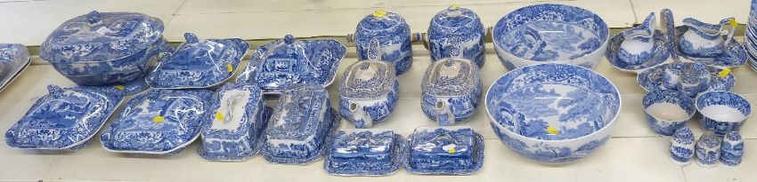 Spode Italian pattern eighteen place setting dinner and tea set with extras comprising 18 x 26.5cm dinner plates, 18 x 23cm plates, 18 x 16cm tea plates, 18 x 23cm soup bowls, 18 x 17cm dessert bowls, 18 cups and saucers, 18 x 14.5cm sandwich plates with three 32cm sandwich plates, three graduated meat plates, largest 43.5cm, two teapots, two milk jugs, two sugars, two butter dishes, two cheese dishes, three pairs of cruets, two pedestal salad bowls, hor d'ourves dish, one large twin handled pedestal tureen, four smaller pedestal tureens, pair of biscuit  barrels.  Approximately 192 pieces in total