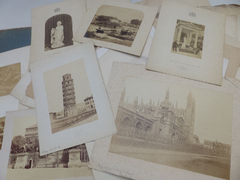 Approximately 65 19thC/early 20thC Grand Tour photographs and similar pictures, many embossed with retailer's names including L.Meder Heidelberg, Budtz Miller & Co Kjobenhavn, P.A.Thoren Christiania, A.Perini Venice, Robert Rive Naples, J.B.Philpot Florence King's College Cambridge, Switzerland, Spain